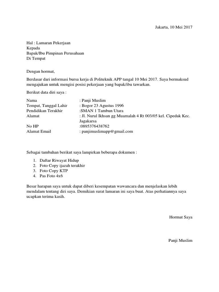 Surat lamaran pekerjaan adalah surat yang diajukan oleh seorang pelamar kerja ke pihak menyebutkan nama perusahaan atau instansi yang dituju . Sebab, melalui surat lamaran kerja, hrd akan memberikan penilaian. Contoh surat lamaran kerja tanpa nama perusahaan dan posisi picture submitted ang uploaded by admin that preserved inside our collection. Jangan hanya mengirimkan cv tanpa surat lamaran, ya! Berikut ini data diri saya: